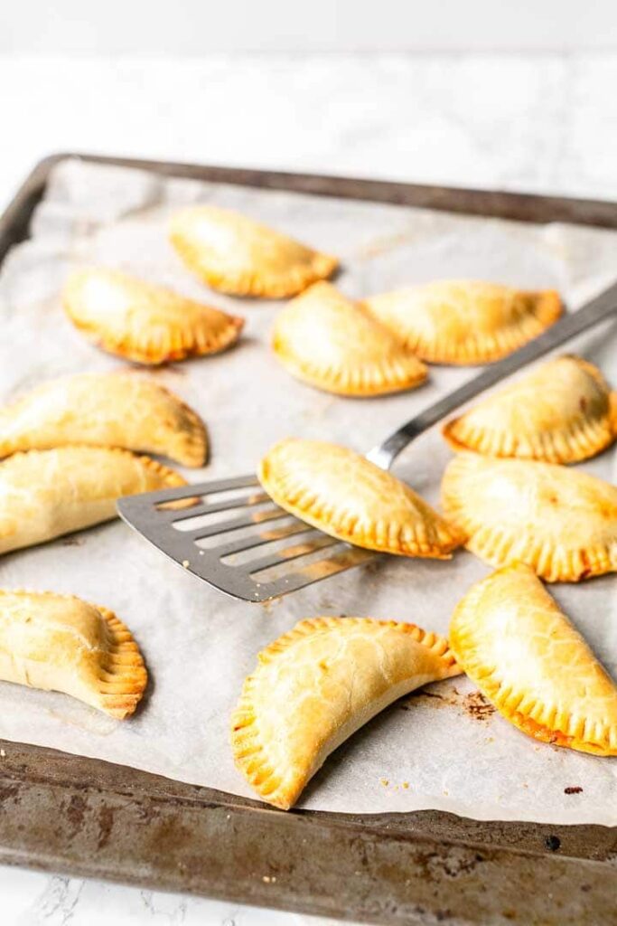 2. Place the empanadas on a baking sheet lined with parchment paper.
